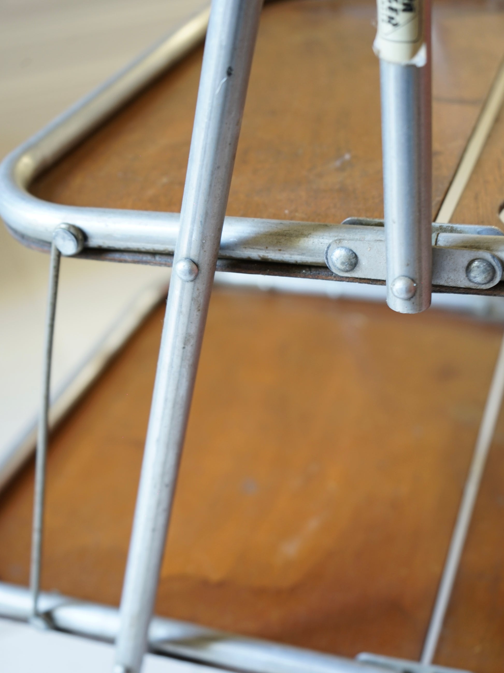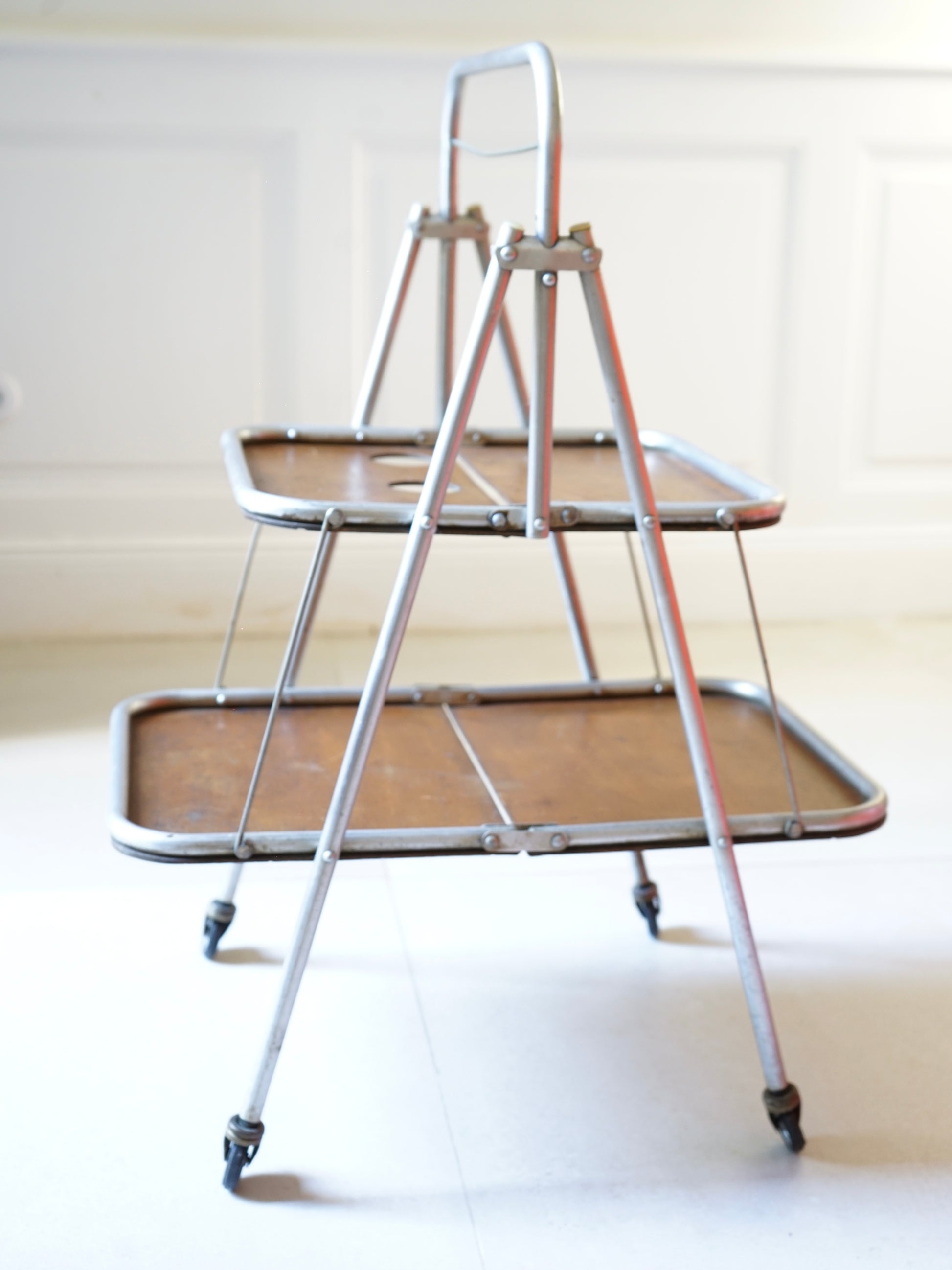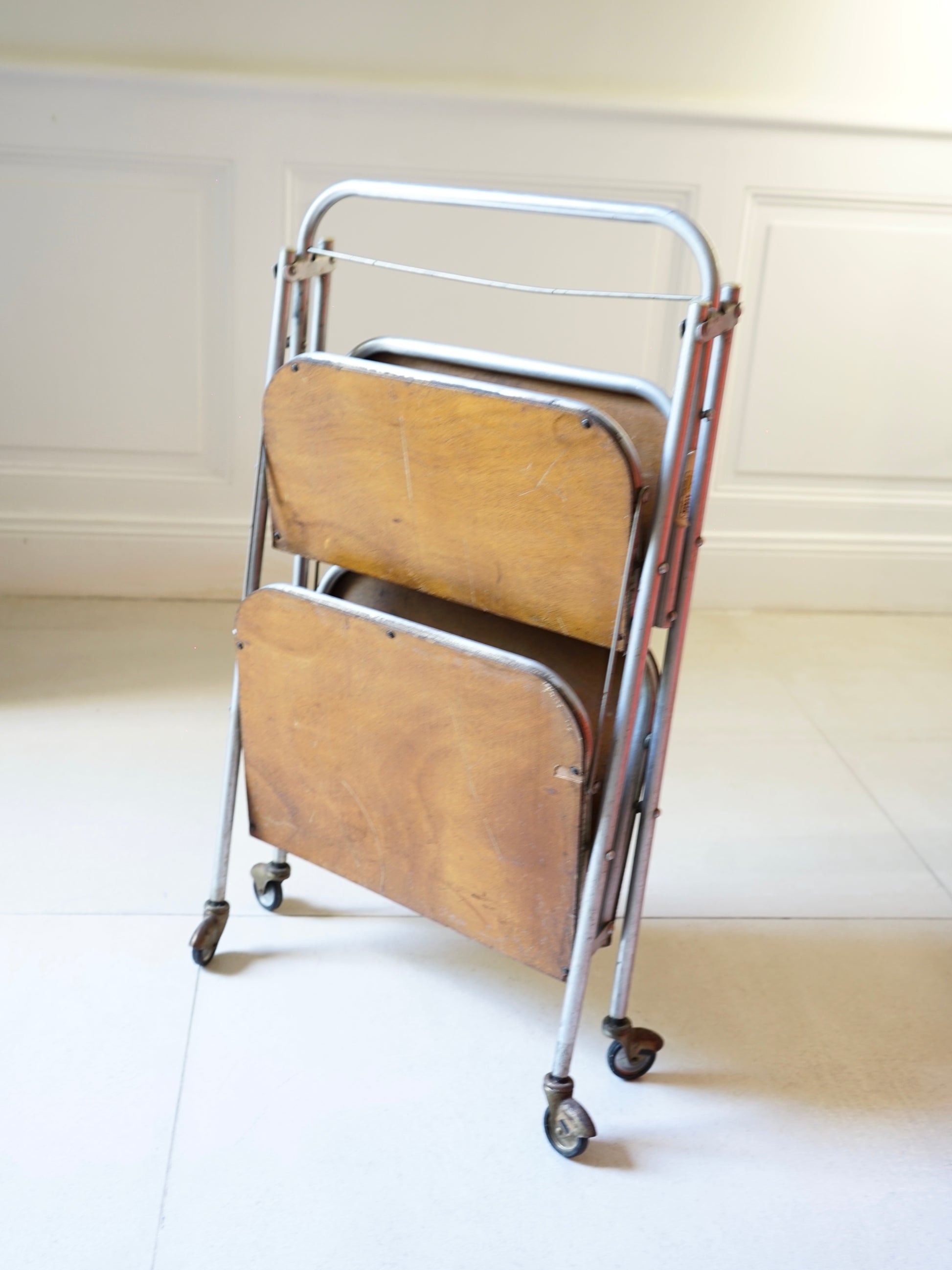 Desserte roulante vintage années 50 de la marque française Pollux portant la mention "ultraléger". Contreplaqué de bois et tubes en inox. Pliable.