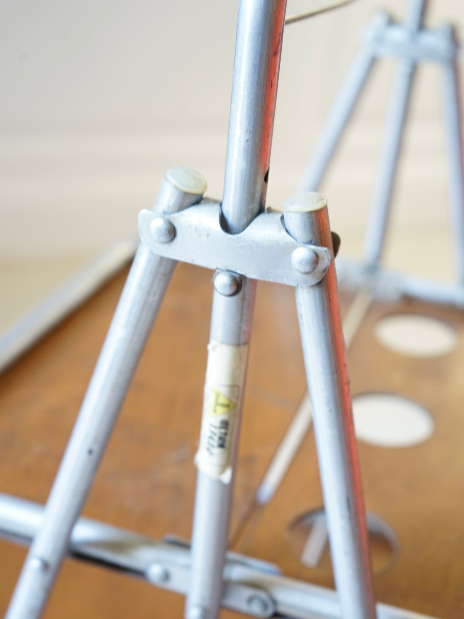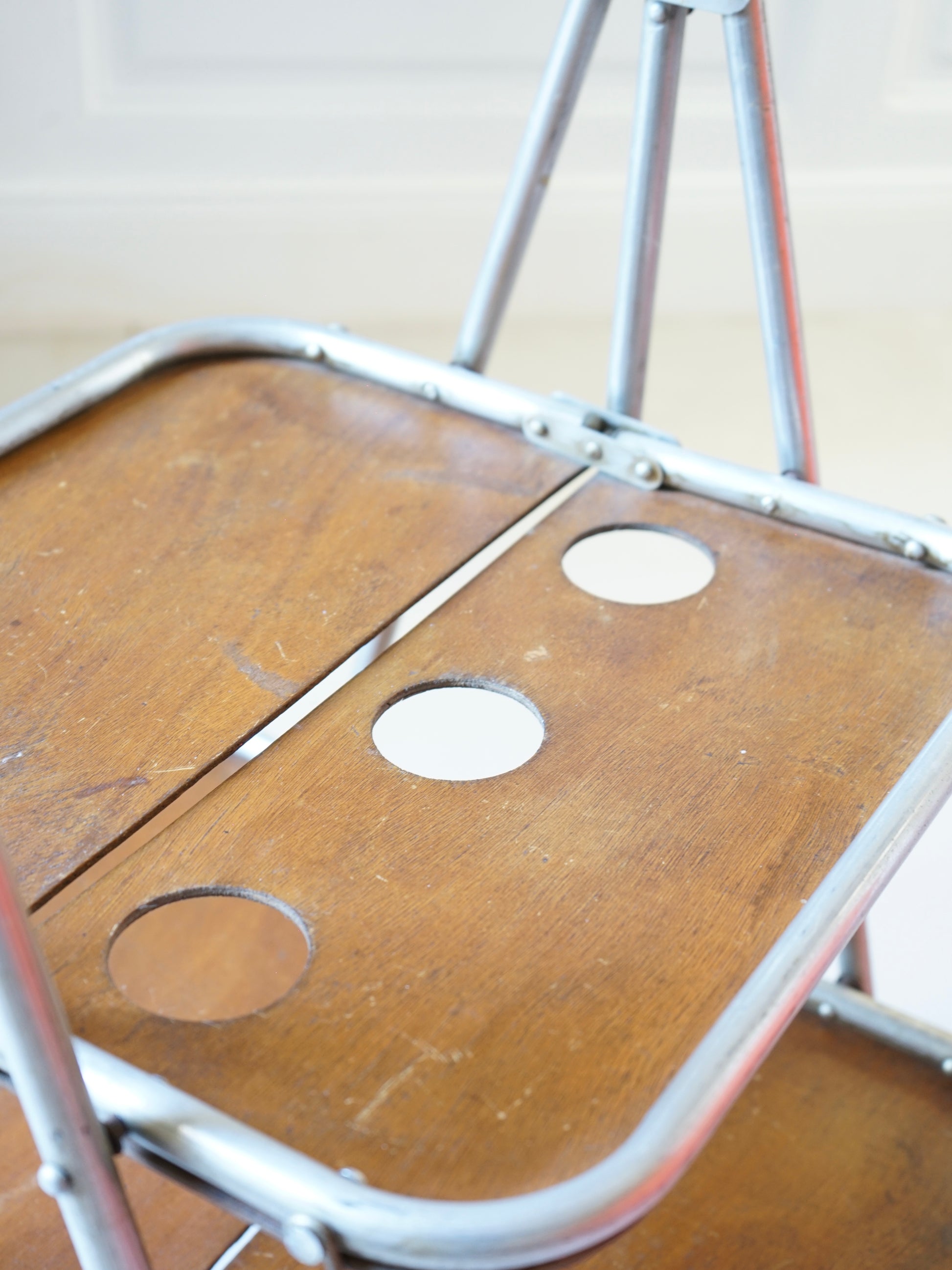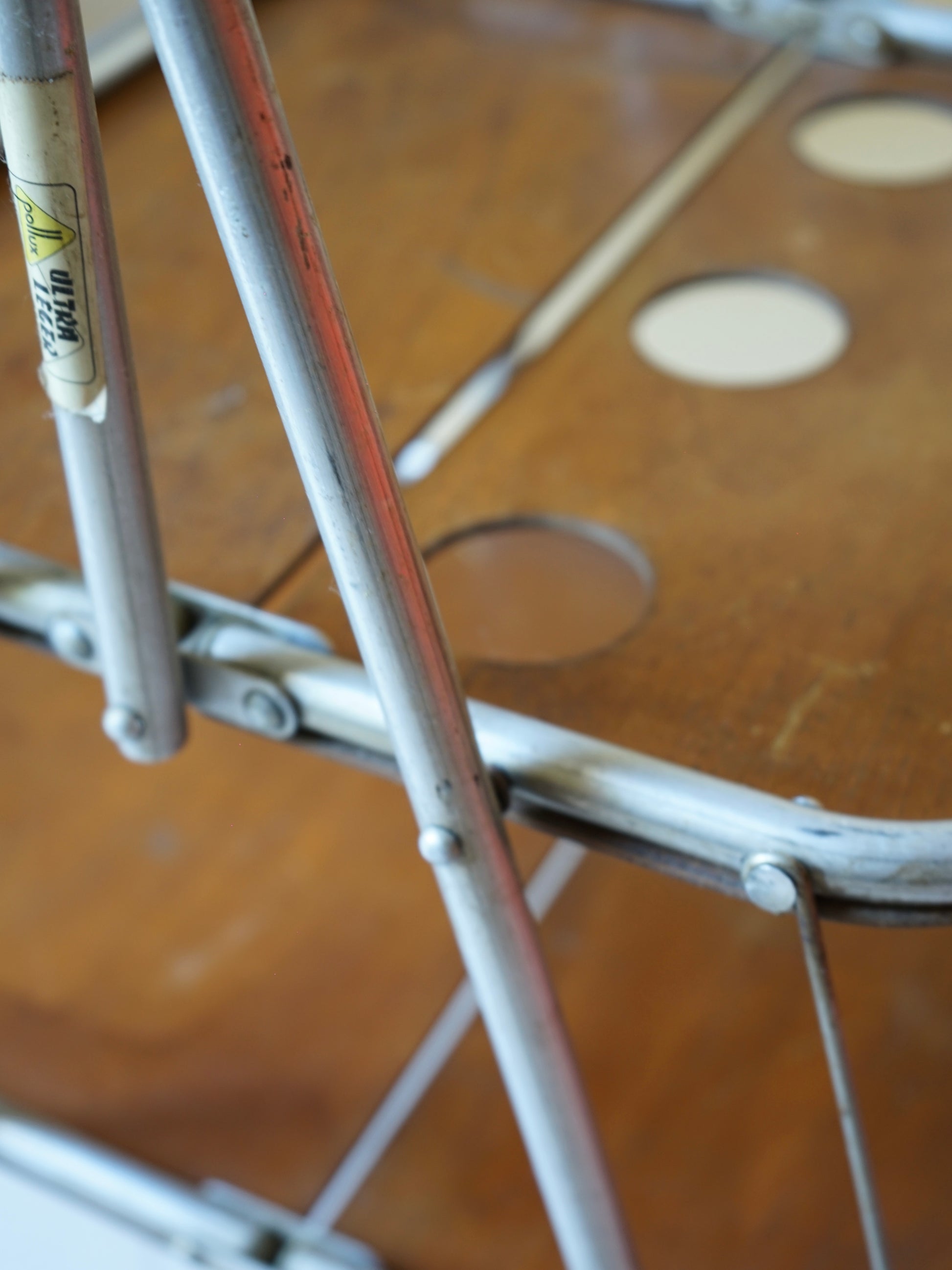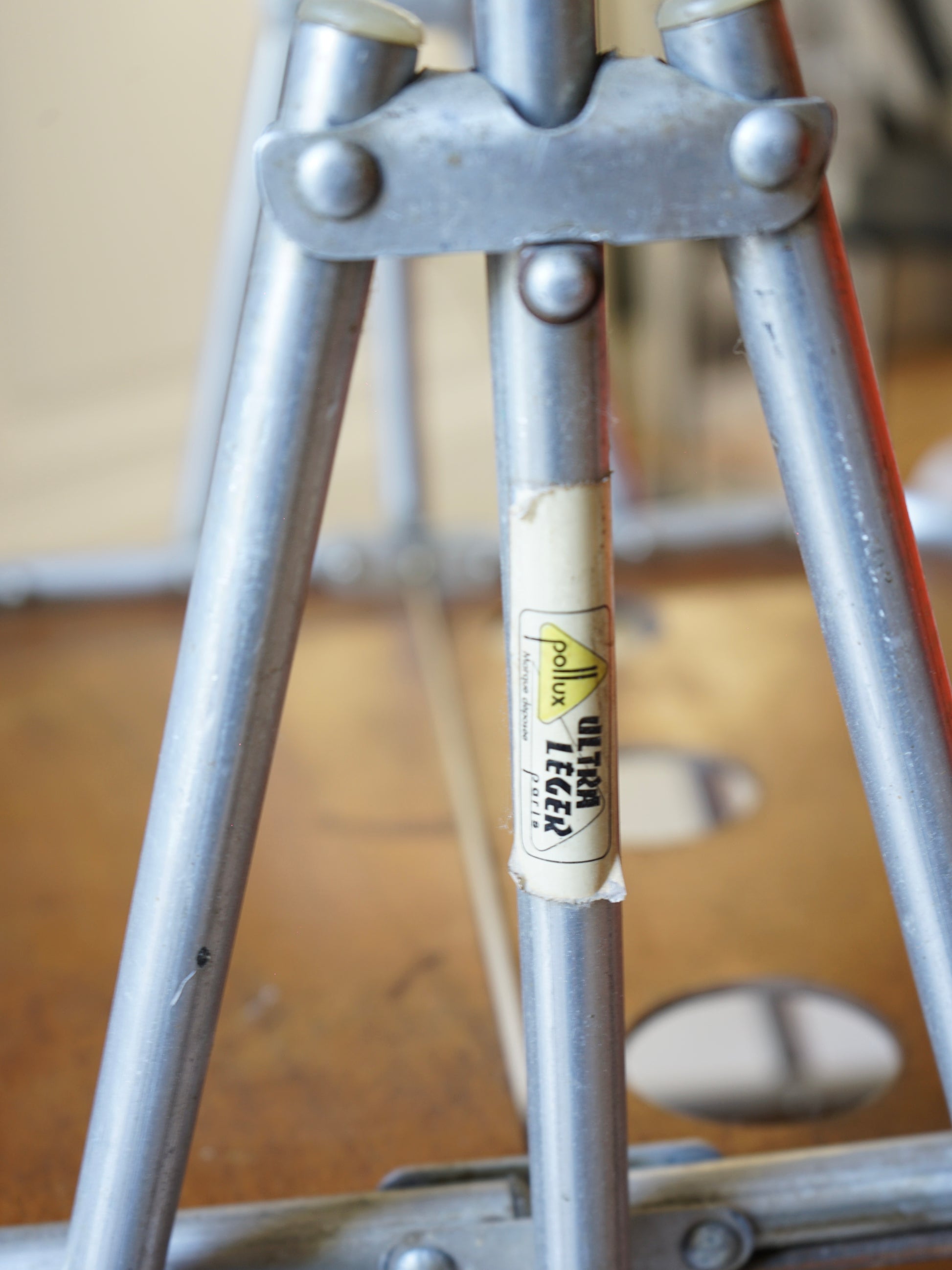 Desserte roulante vintage années 50 de la marque française Pollux portant la mention "ultraléger". Contreplaqué de bois et tubes en inox. Pliable.