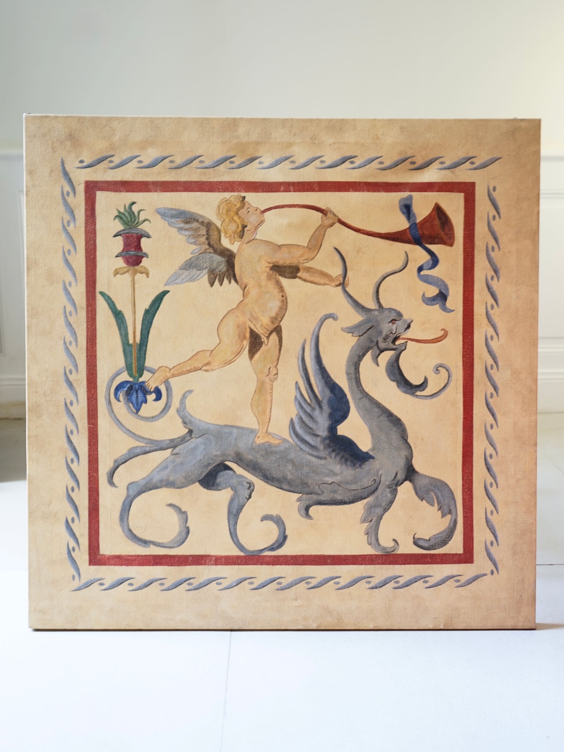 Grande peinture à l'huile décorative représentant un putto et un dragon, tradition des grotesques italien de la Renaissance. Cadre bois au verso.